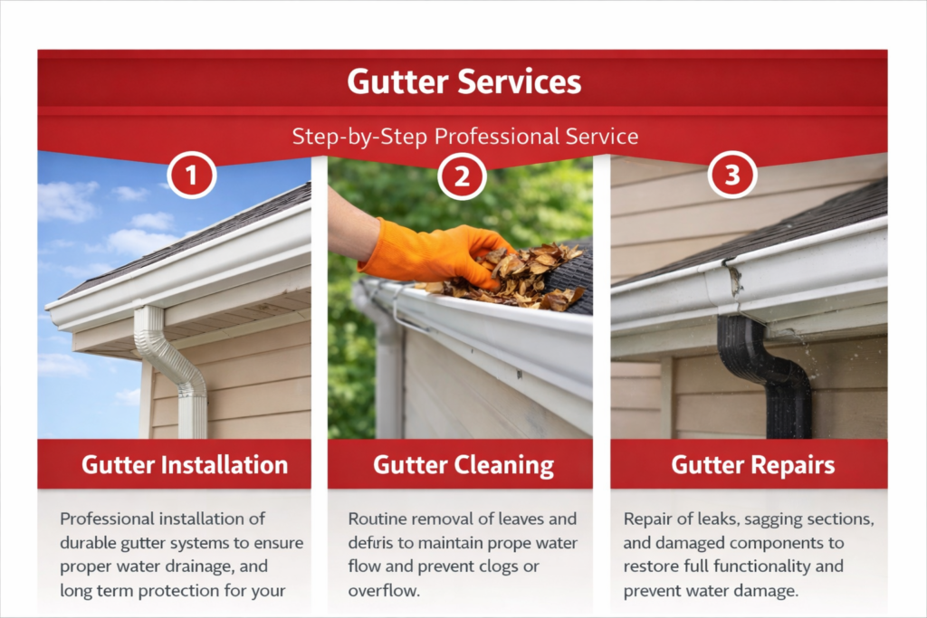 Gutter Installation & Repair Protect your home from water damage with professionally installed and maintained gutter systems. We install and repair durable gutters that efficiently channel rainwater away from your foundation, preventing leaks, erosion, and structural damage. Reliable protection. Seamless performance.